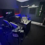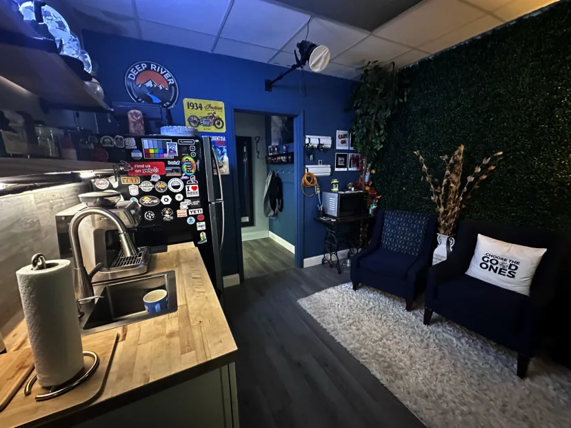 The main set includes seating options for up to four people, adjustable colored lighting, and multiple angles for dynamic, cinematic shots. Cameras are pre-rigged for quick setup, and the room is acoustically treated for clean, rich audio. A dedicated production area lets you monitor your shoot and switch cameras.